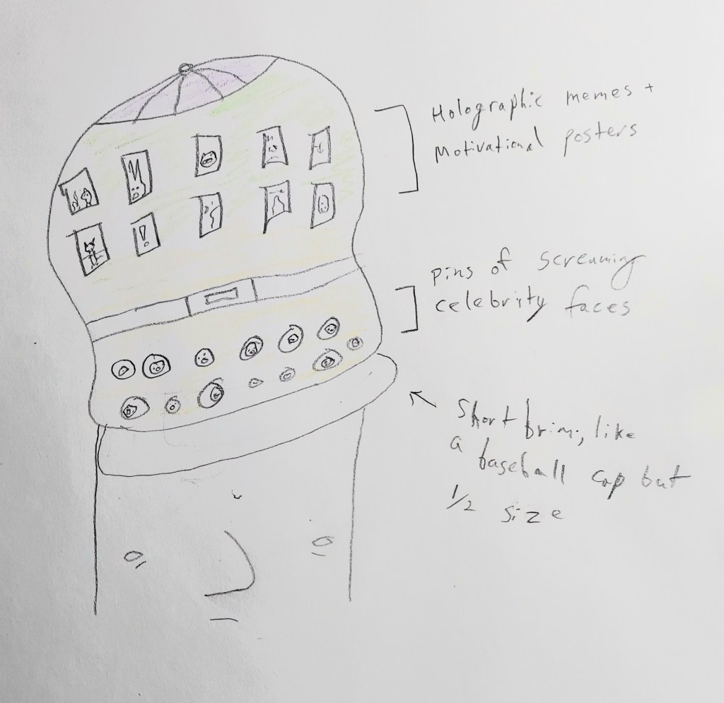 Later in the dream, I found my way into a small shop, much like a store in a mall, though the interior was half-destroyed and wildly disorganized. From there, I and a few strangers that I picked up along the way as traveling companions, were made to exit into a kind of courtyard space after being accused of stealing, only to find that thousands of others had done the same. Everyone there in that walled garden danced in huge clusters, all wearing the same sort of ceremonial garb. Their clothing resembled that of medieval minstrels, very colorful – green, purple, and yellow – adorned with frills and other bangles. As we moved through the crowd, I couldn’t help but be alarmed by the palpable fear in the air. Everyone was nervous for a reason I could not identify, which of course made me nervous as well. One notable occurrence in this section of the dream that didn’t really feel coherent was the addition of a police officer in the crowd who was wearing a most extraordinary hat. Sketch below.